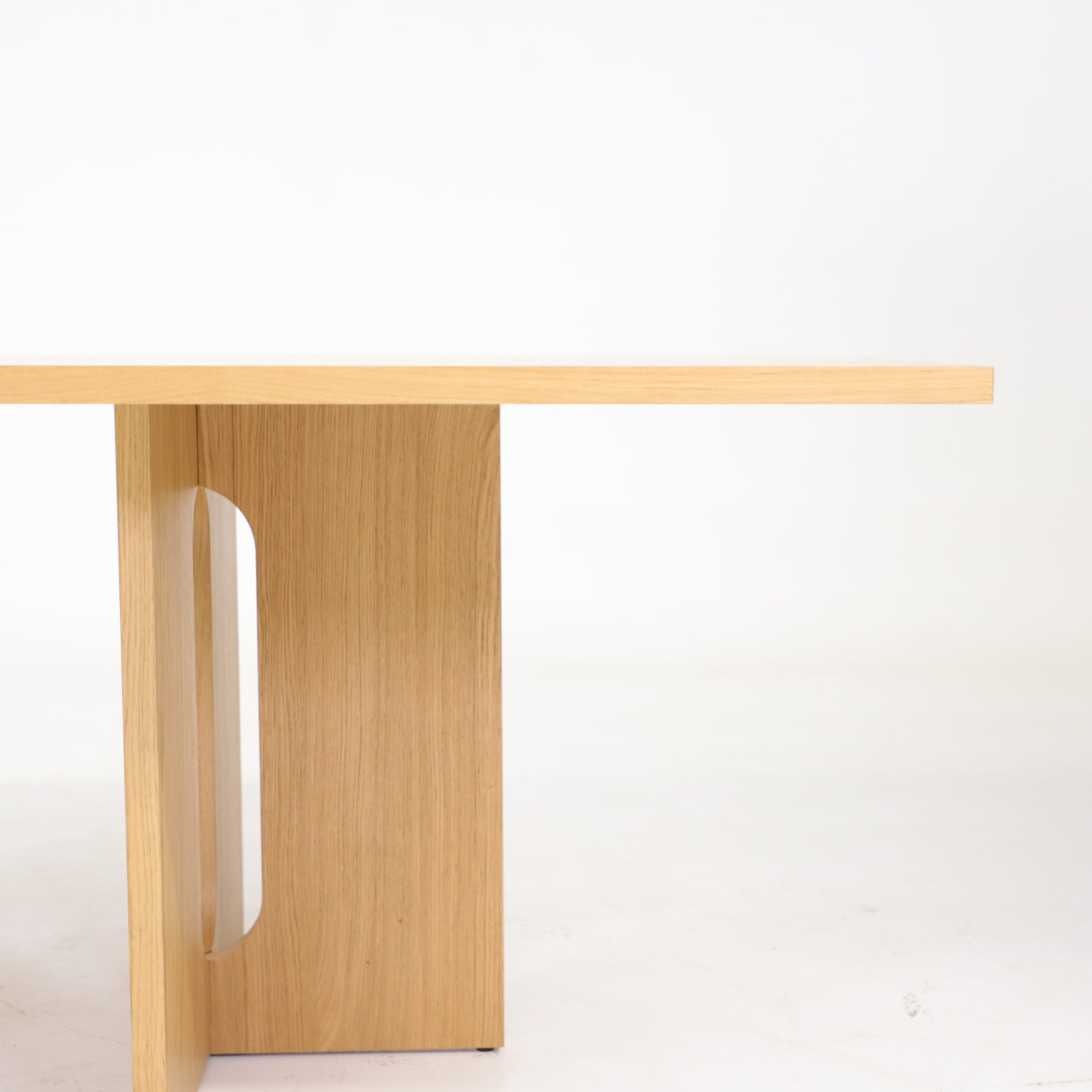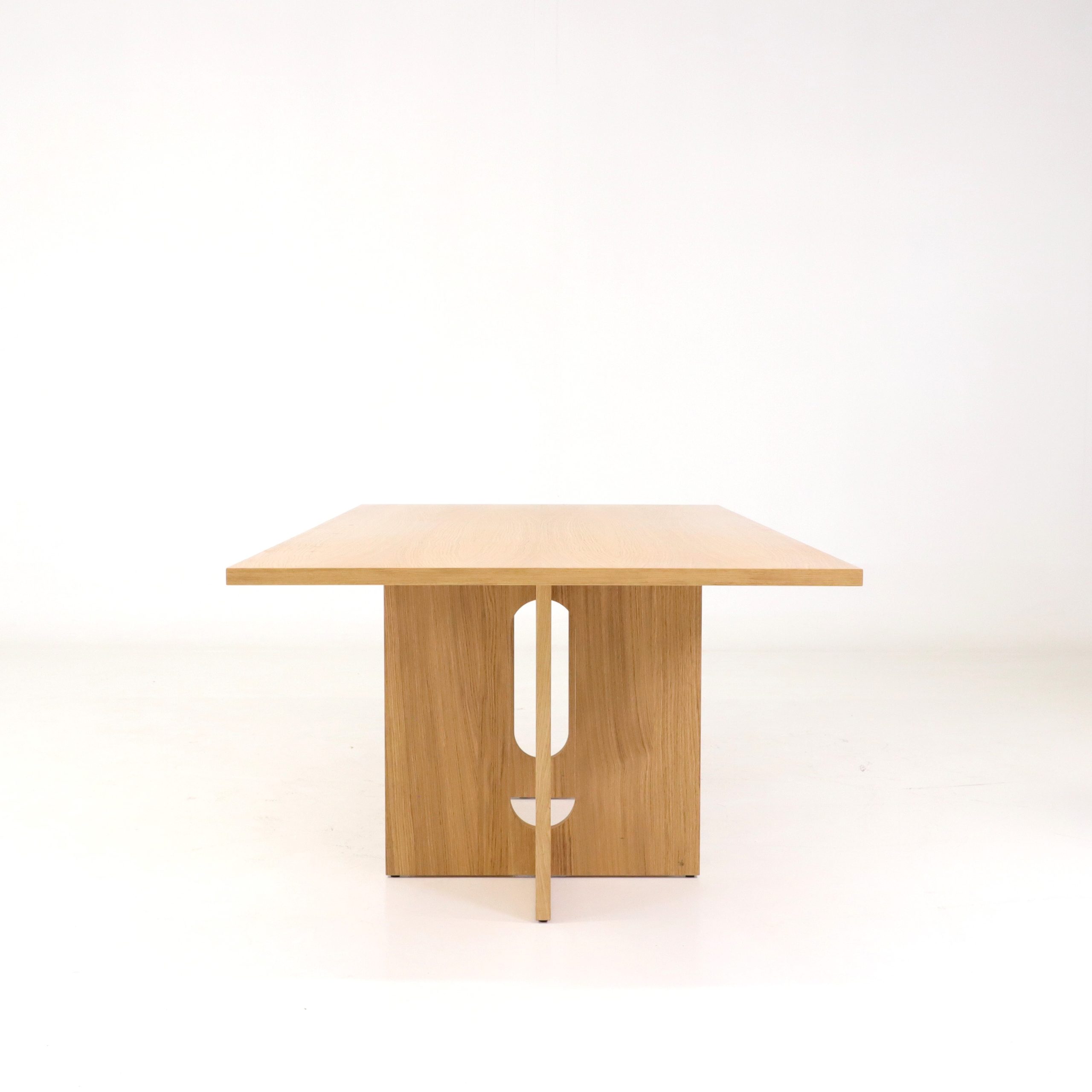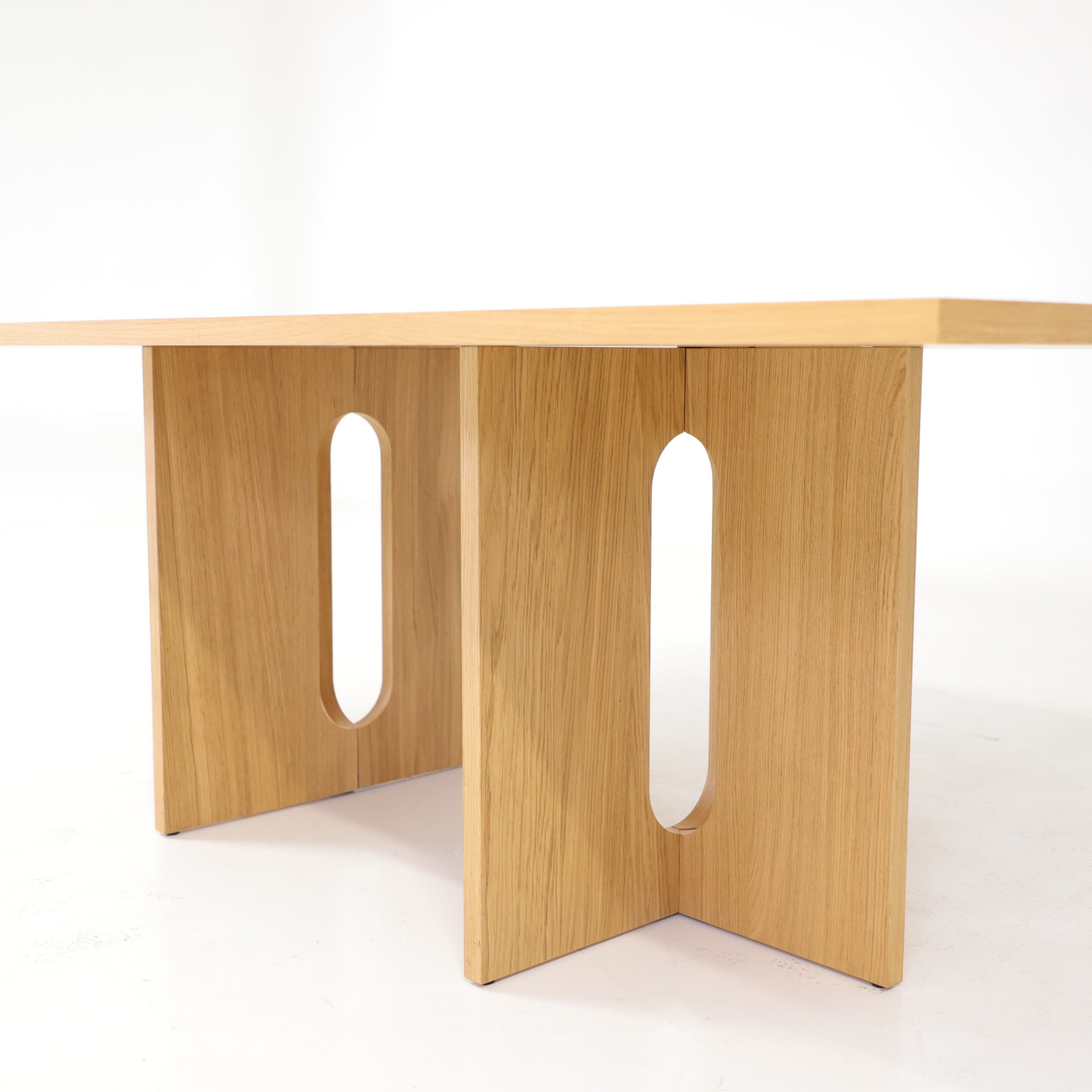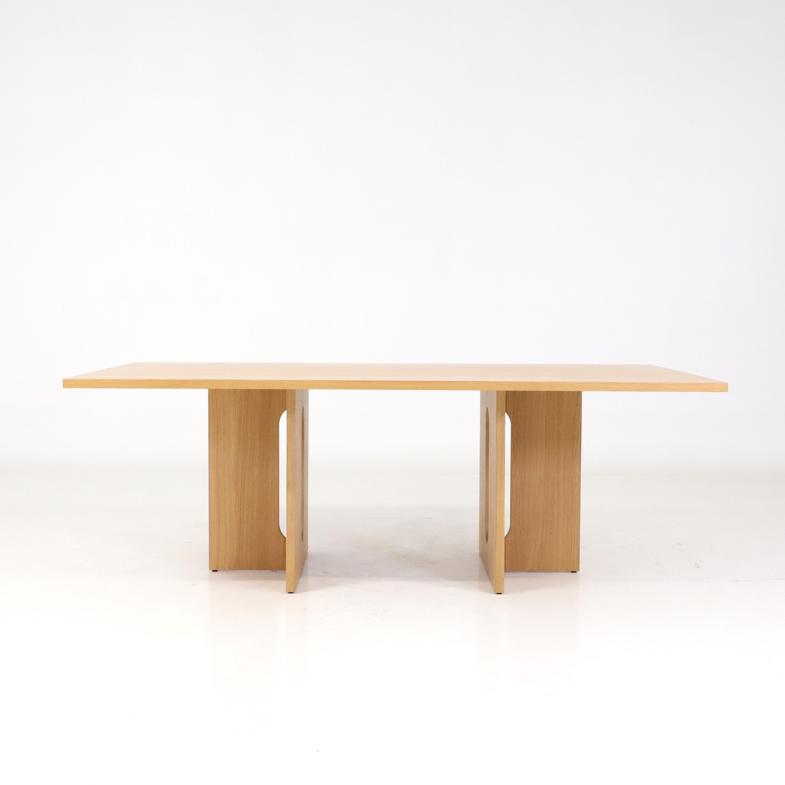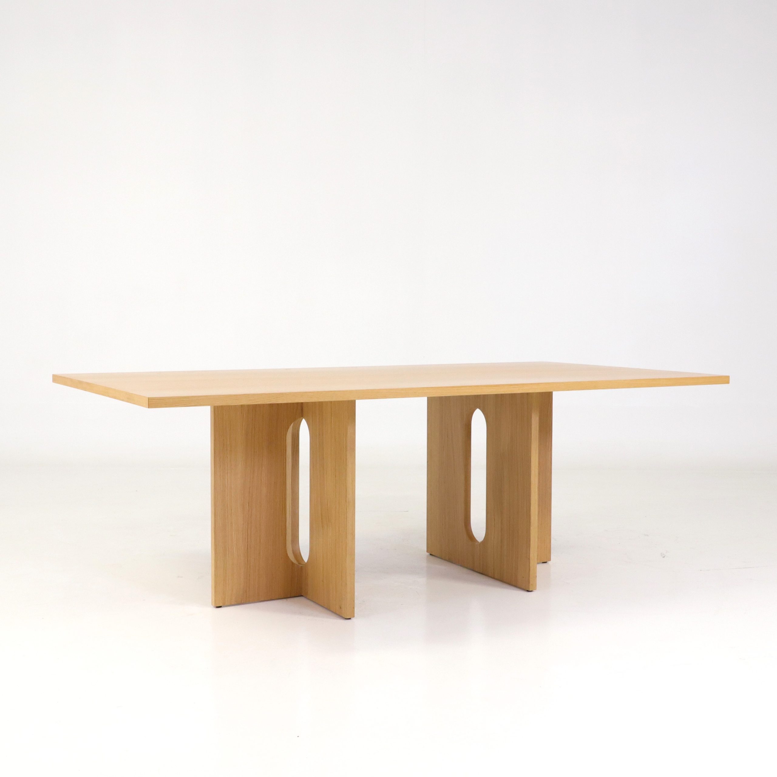 Detta bord Androgyne från Audo Copenhagen är ett uttryck för skandinavisk design i sin mest balanserade form, där funktion möter skulptural estetik. Bordet präglas av en vacker siluett med sin karaktäristiska korsformade bas, där de mjuka, ovala utskärningarna skapar en subtil kontrast till de raka linjerna. Bordet kommer här i en ekfanér där naturens struktur och värme framhävs, vilket ger bordet ett lugnt och tidlöst uttryck.
