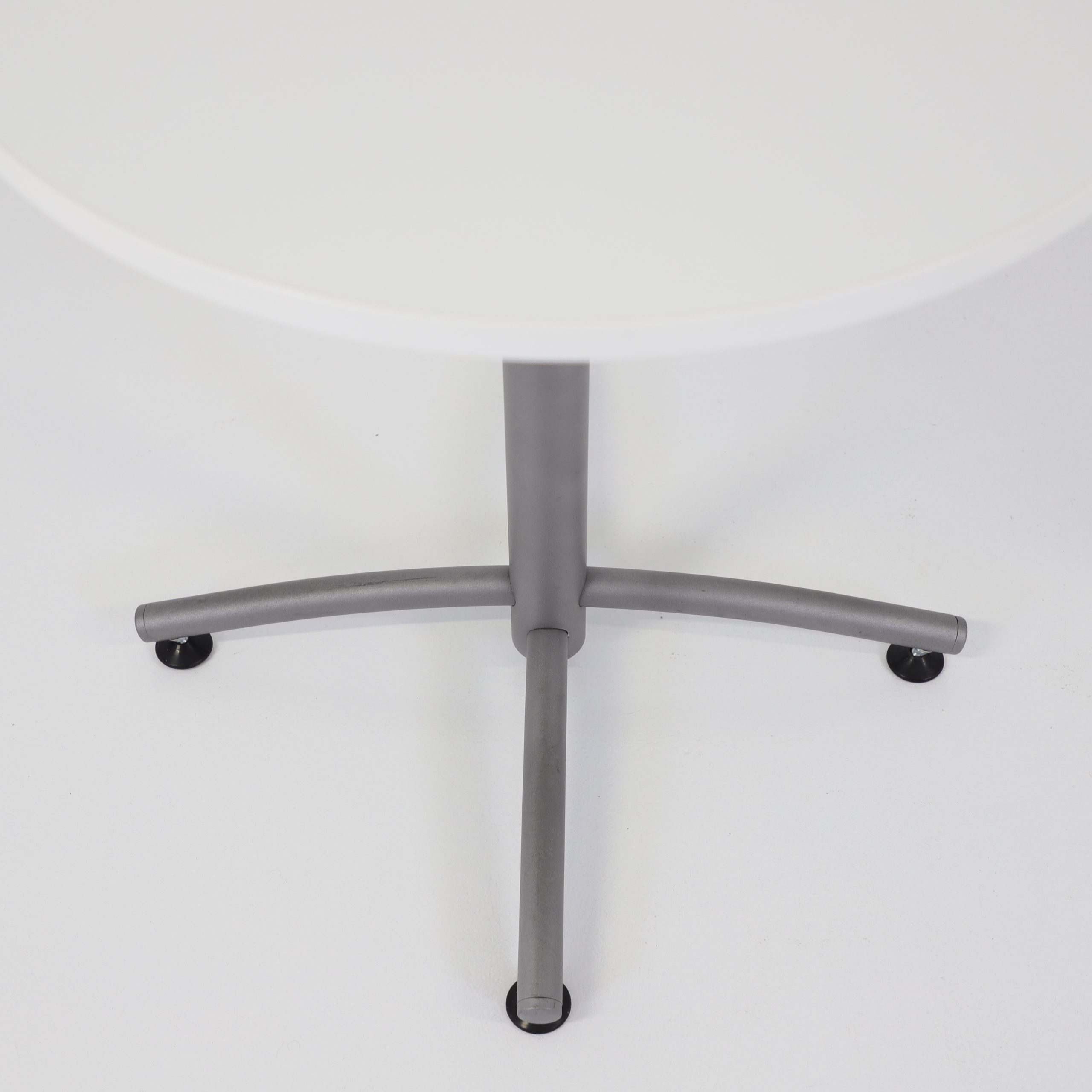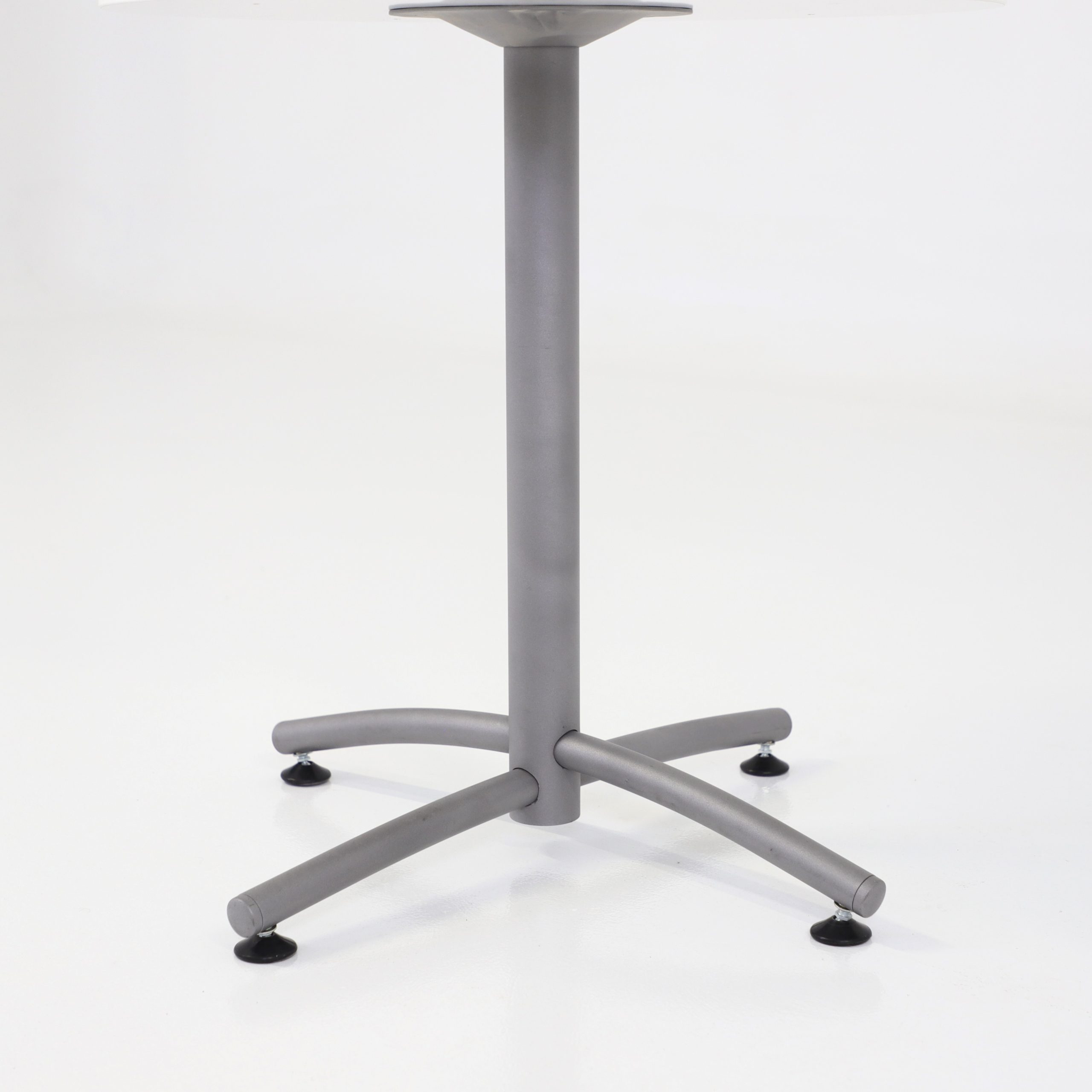 Fikabordet Avec från EFG är ett stilrent bord med sin runda bordsskiva* i vitt med fasad träkant. Det gråa stativet har en unik kryssfot som gör bordet stabilt, och samtidigt bidrar till dess signifikativa och karaktäristiska drag.