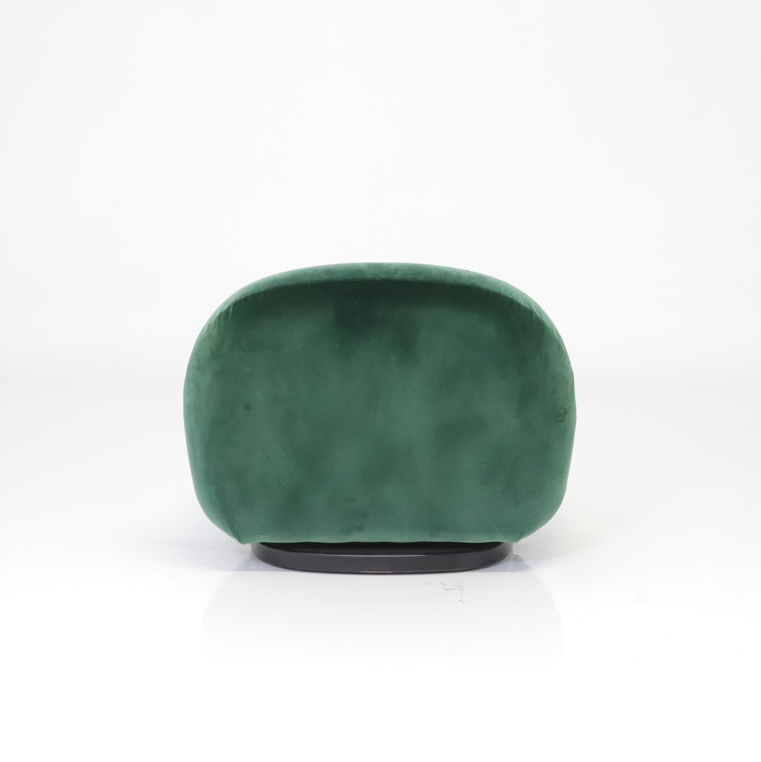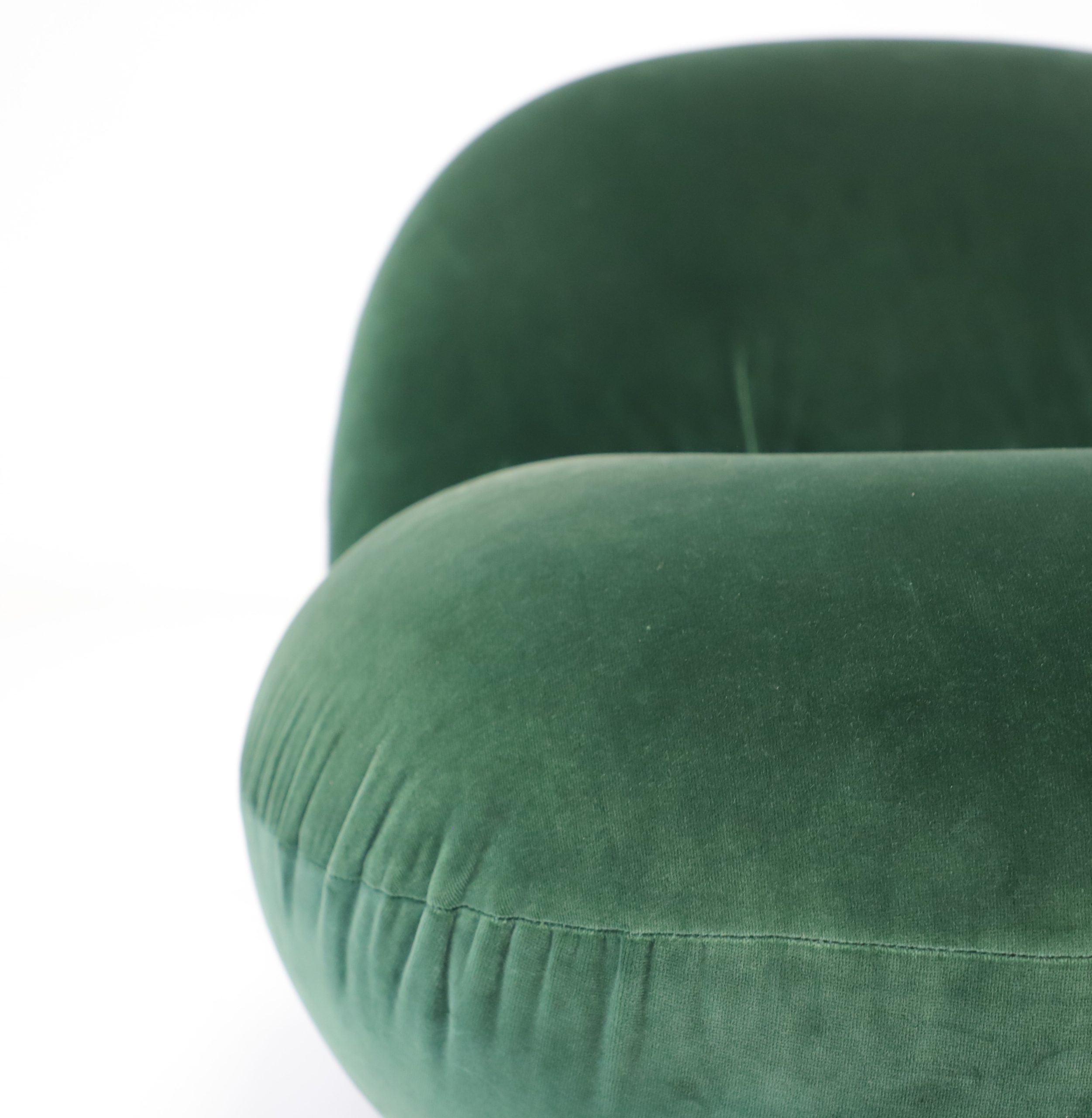 Sammetsytans djupa gröna ton och mjuka lyster för tankarna till naturens grönska och skapar en känsla av värme, elegans och exklusivitet i rummet. De noggrant formade sömmarna som drar in mot mitten framhäver fåtöljens mjuka, skulpturala linjer och ger den ett levande uttryck. En karaktärsstark möbel som lika självsäkert fungerar som färgaccent, kontrast till neutrala toner eller som en lyxig mittpunkt i inredningen.