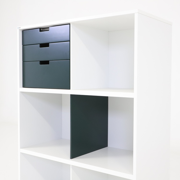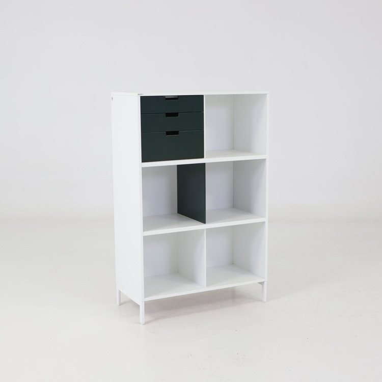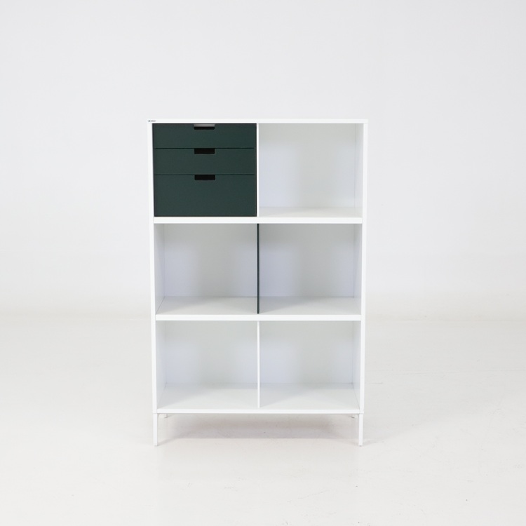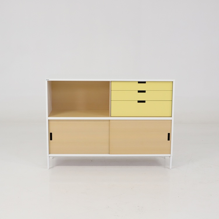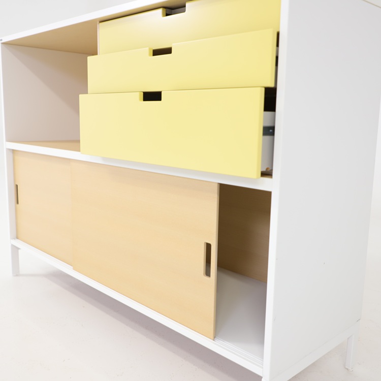 Praktiskt skåp från Edsbyn med lådor och skjutdörrar i mjuk gul ton eller härlih blå nyans. En välbalanserad kombination av öppen förvaring, praktiska lådor och dold förvaring bakom skjutdörrar som är gjord för att kunna stå mitt i rummet då den är lika fin från alla sidor. Stabil konstruktion med tidstypisk design som passar lika bra i kontor som i kreativa miljöer. Ett funktionellt och karaktärsfullt förvaringsskåp med tydlig skandinavisk känsla.