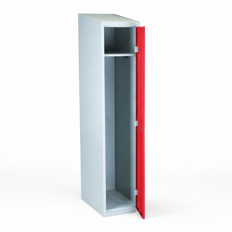 Klädskåpet är ett klassiskt val för personlig förvaring, ett stilrent och funktionellt skåp som passar lika bra i omklädningsrummet som i hallen eller längs korridoren. Med sina kulörta blåa eller röda dörrar ger det ett välkomnande och färgstarkt intryck i alla miljöer. Klädskåpet är pulverlackerat med grå stomme och kulört dörr, vilket ger den dess goda hållbarhet.
