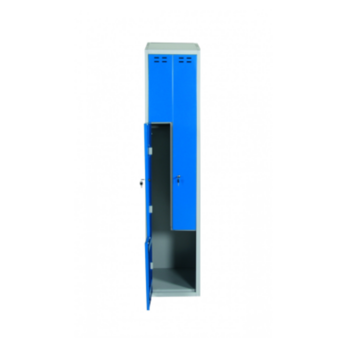 Skåpet är välventilerat med dubbla ventilationsgaller, utrustat med cylinderlås för trygg förvaring och sluttande tak som underlättar rengöring. Tack vare en innovativ konstruktion monteras klädskåpet enkelt utan skruvar eller verktyg – perfekt för snabb installation.