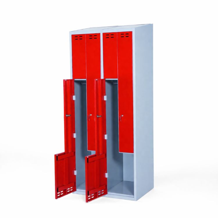 Klädskåp Z-modell är ett klassiskt val för personlig förvaring, ett stilrent och funktionellt skåp som passar lika bra i omklädningsrummet som i hallen eller längs korridoren. Med sina kulörta blåa eller röda dörrar ger det ett välkomnande och färgstarkt intryck i alla miljöer. Klädskåpet är pulverlackerat med grå stomme och kulört dörr, vilket ger den dess goda hållbarhet.