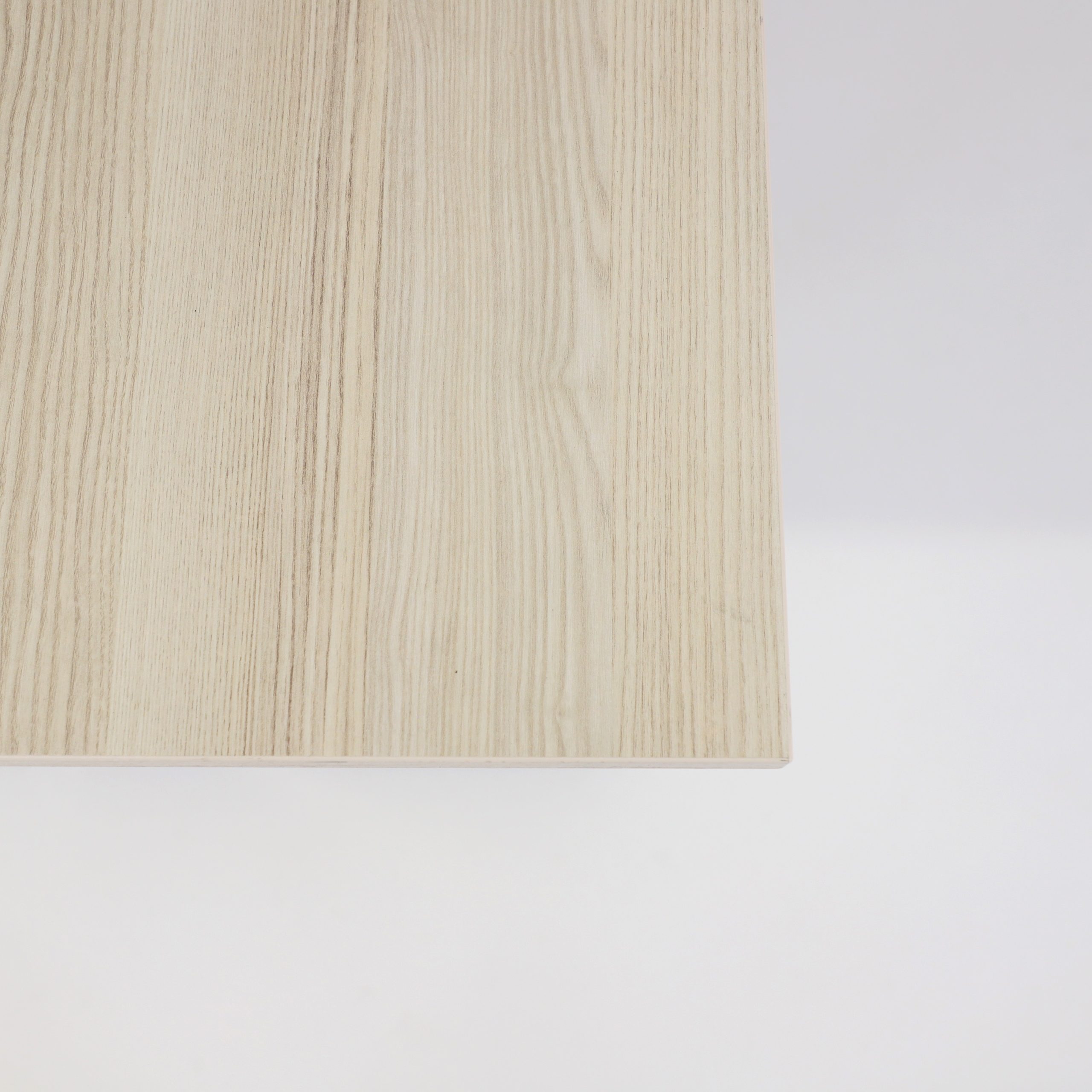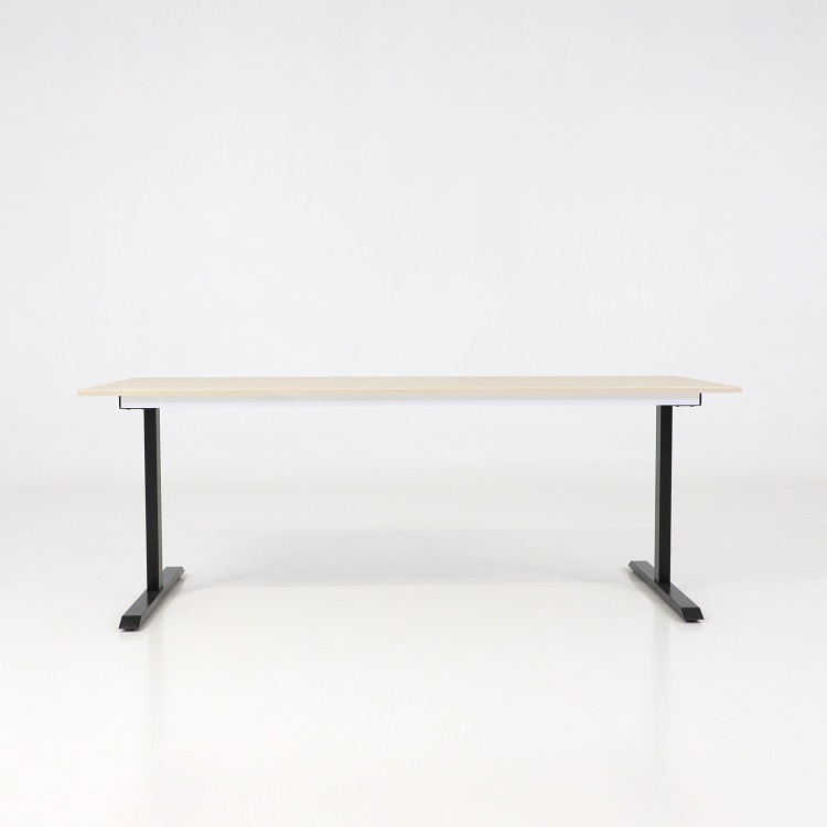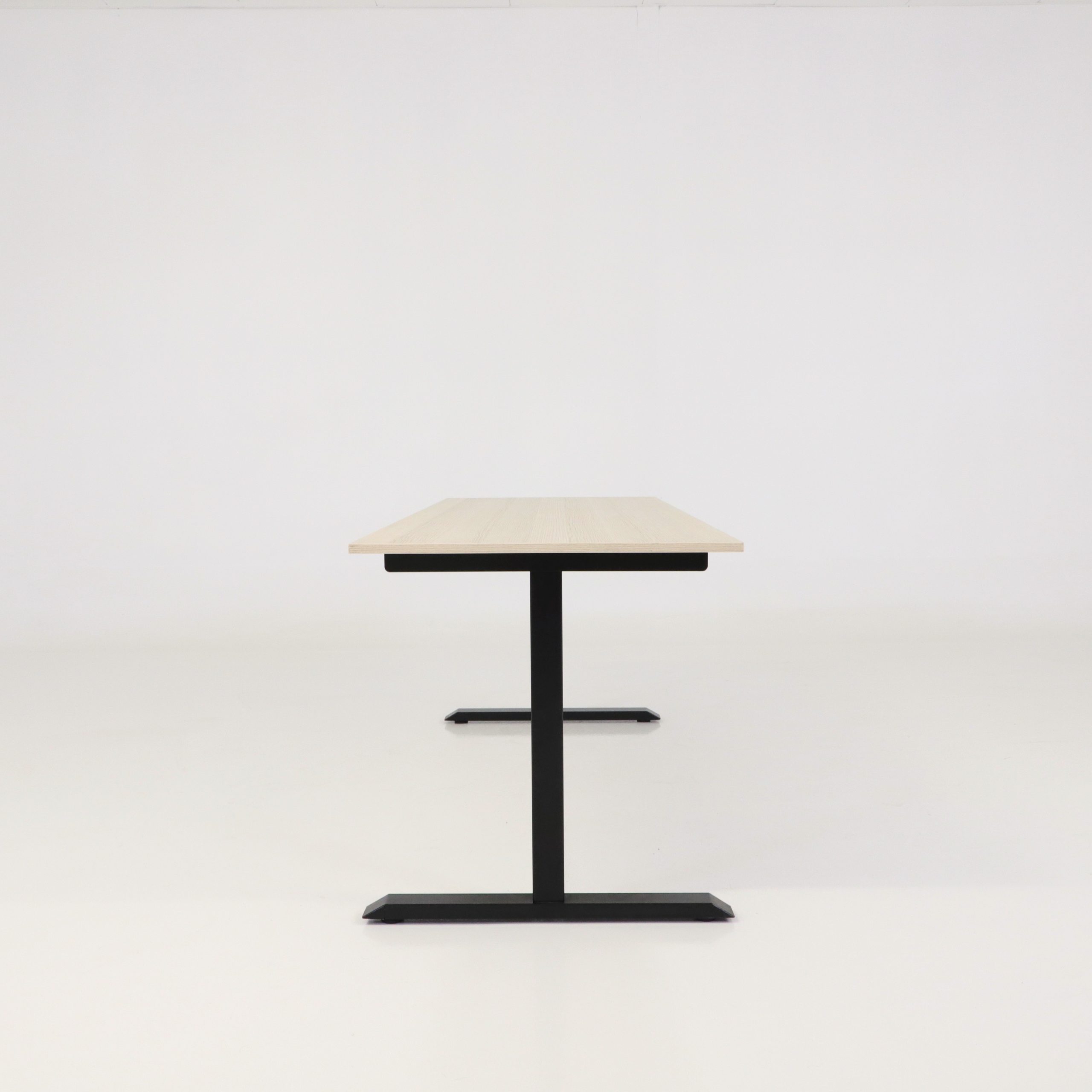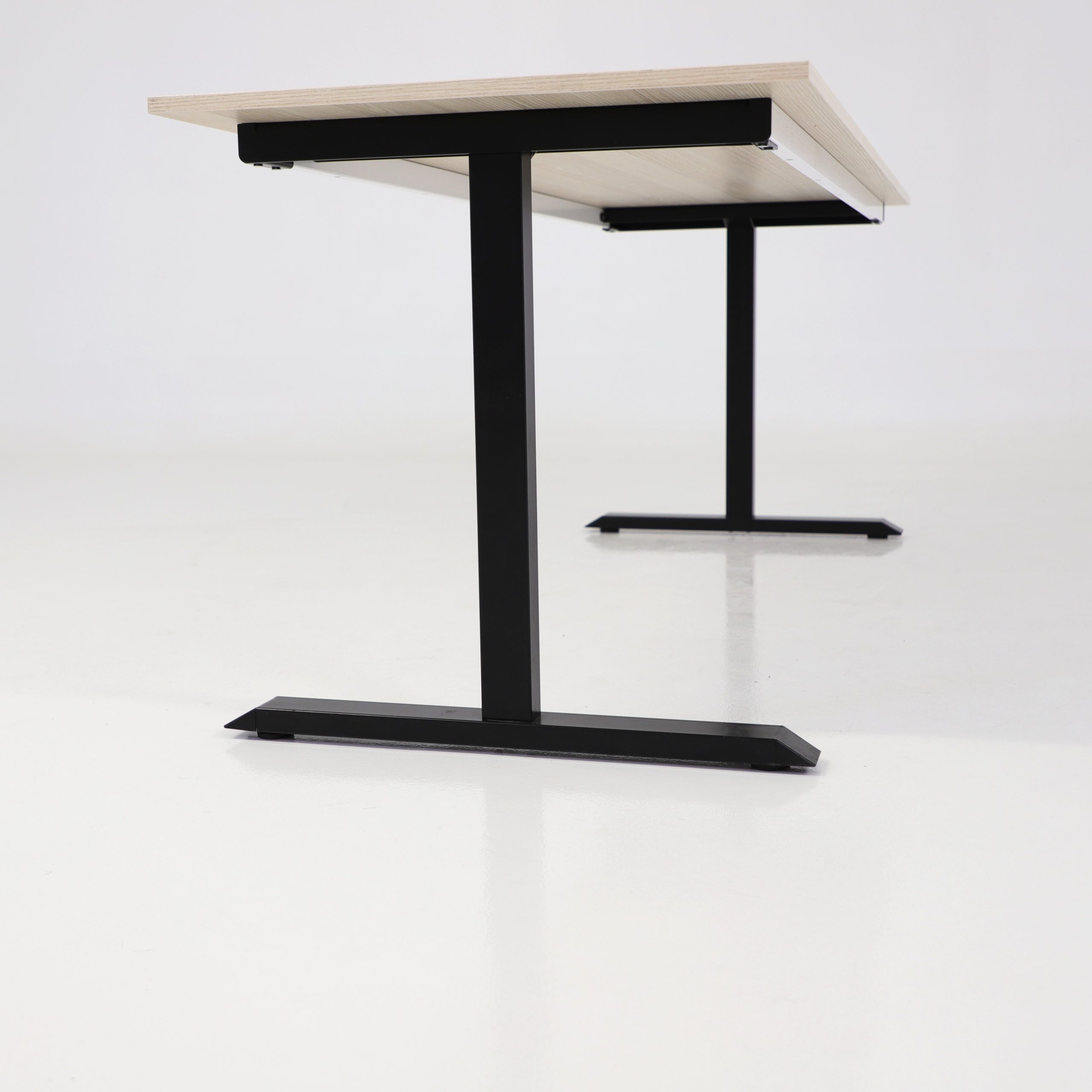 En stilrent skrivbord som med sin generös arbetsyta kombinerar funktionalitet och modern design. Bordsskivan i ljus träfinish i laminat skapar en varm och naturlig känsla, medan det svarta metallstativet ger en stabil och markerad kontrast.