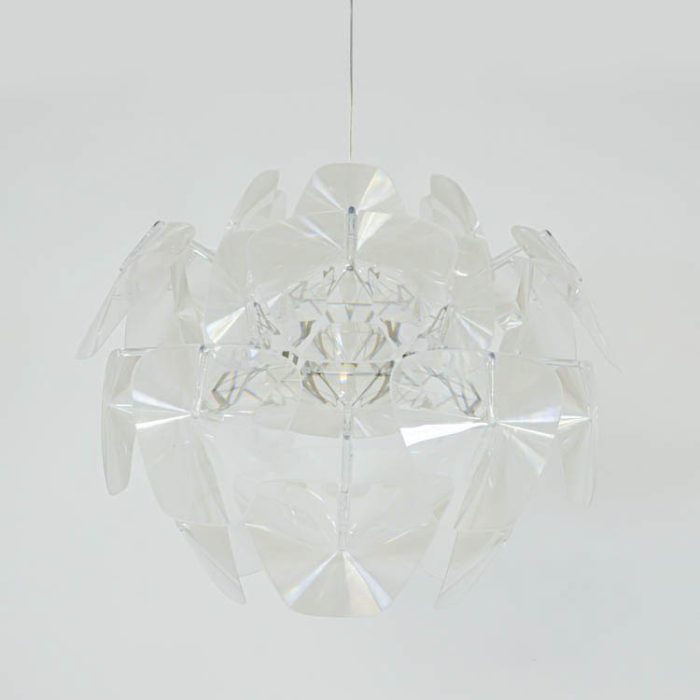 Magnifika takpandeln Hope från Luceplan är designad av Francisco Gomez Paz och Paolo Rizzatto år 2010. Detta konstverk har blivit en modern ikon inom design som kombinerar traditionellt formspråk med samtida material. De tunna bladen av präglad polykarbonat är formade för att efterlikna glas, men tack vare mikroprismatisk film uppstår ett reflekterande skimmer som ger rummet ett glittrande, nästan festligt ljusspel.