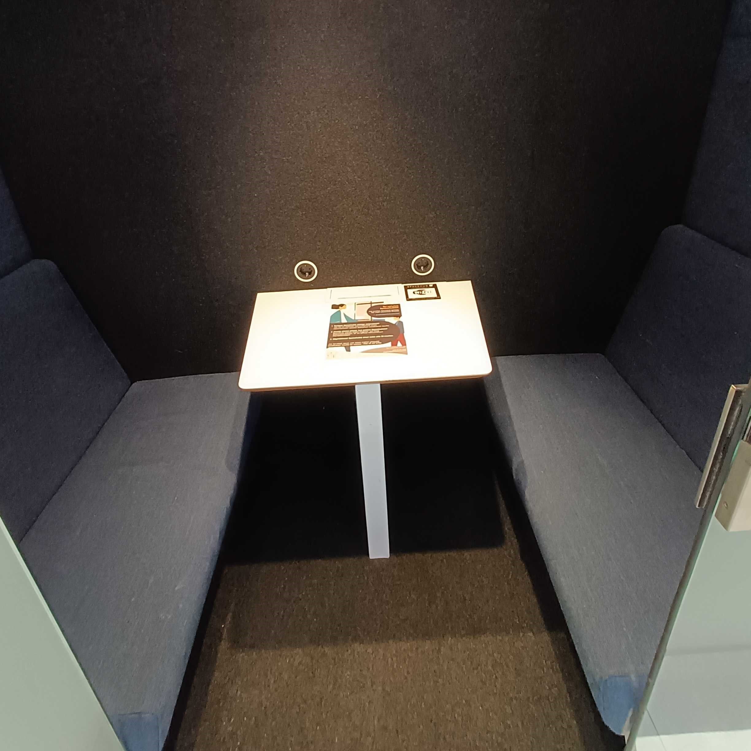Rummet är utrustat med effektiv ventilation och luftkonditionering som säkerställer ett behagligt inomhusklimat även vid längre användning. Den låsbara dörren med tillhörande nyckel ger extra trygghet och integritet, vilket gör rummet särskilt lämpligt för konfidentiella samtal eller arbetsuppgifter som kräver avskildhet. Rummet är inrett med bekväma soffor, ett praktiskt bord samt integrerade eluttag som gör det enkelt att arbeta effektivt och under längre perioder.